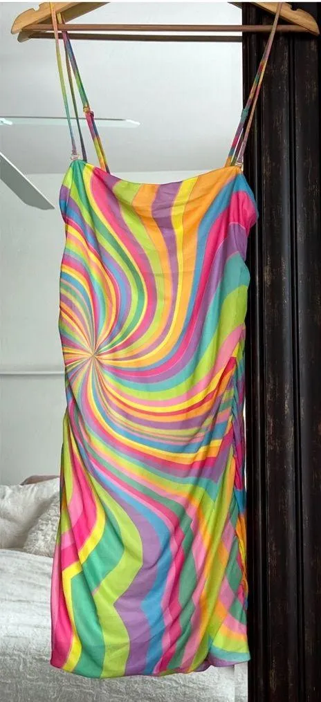 Take a trip in this psychedelic micro mini! A slinky little number with a bodycon fit and ruching th... Show more