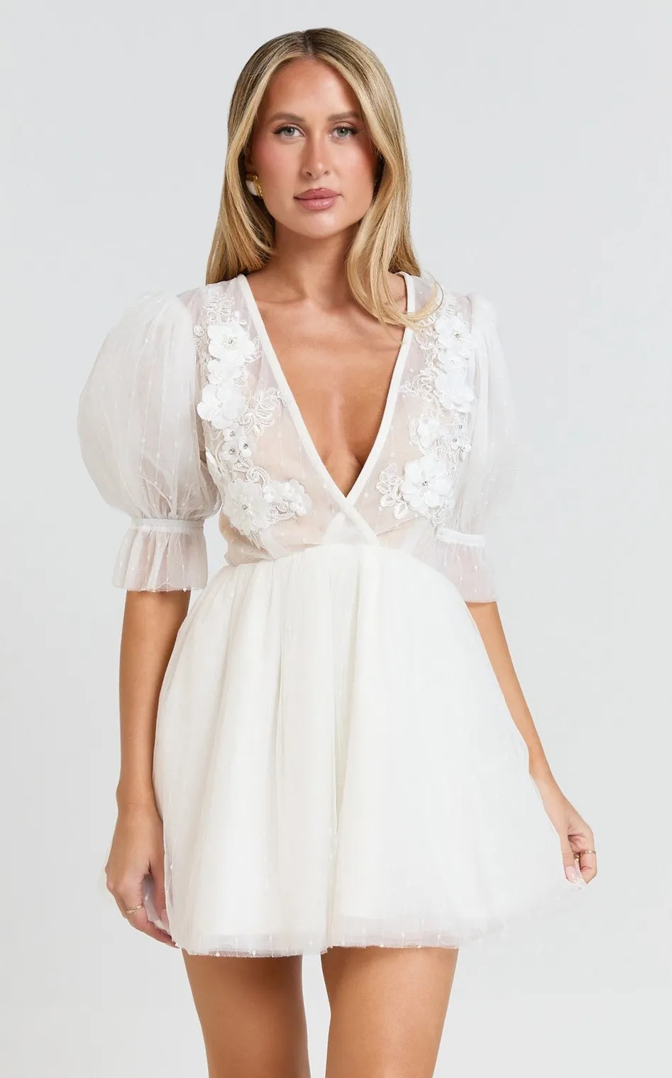 Capture ethereal charm with this Showpo Akshia mini dress. Delicately crafted with sheer polka dot tulle overlaying a sweetheart bodice, this dress features enchanting 3D floral appliqués adorned with subtle pearls cascading down the plunging V-neckline. The dramatic puff sleeves are gathered at the wrist with a ruffled cuff, while the ethereal tulle skirt floats gracefully. Perfect for a romantic engagement party, a whimsical bridal shower, or a dreamy summer evening out. Style: Mini, Wrap Dress Dress Length: Short Department: Women Sleeve Length: Half Sleeve Pattern: Polka Dot Occasion: Wedding, Party/Cocktail Material: Polyester, Tulle Fabric Type: Mesh Neckline: V-Neck Season: Spring, Summer Sleeve Type: Balloon Sleeve Closure: Pullover Accents: Embroidered, Beaded, Ruffle Keywords: Showpo dress, mini dress, puff sleeve dress, floral applique, plunge neck, white dress, tulle dress, bridal shower, engagement party, special occasion, romantic, whimsical, feminine
