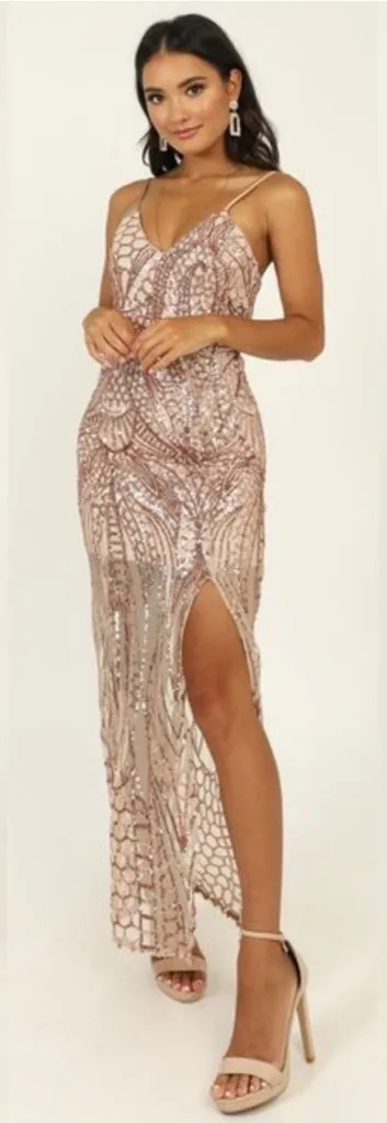 PLEASE NOTE: Tagged a size 10 but fits like a XS/S. Unsure if it's in Australian sizing which correlates to a U.S. size 6. Please refer to the flat measurements included in this description for sizing. As you can see the dress wouldn't even fully zip on my slender mannequin. Size 10 (fits like XS/S) Flat measurements PTP: 14" Waist: 13" Length from armpit: 48" Slit length: 26" Gold/rose gold color. The dress is lined until about mid thigh. Condition: Small separation of the stitching at the top of the side slit as shown in the last picture. May be some missing sequins but overall not noticeable. Keywords: New Years dress, party dress, sequin dress, prom dress, sparkly dress, glittery dress, maxi dress