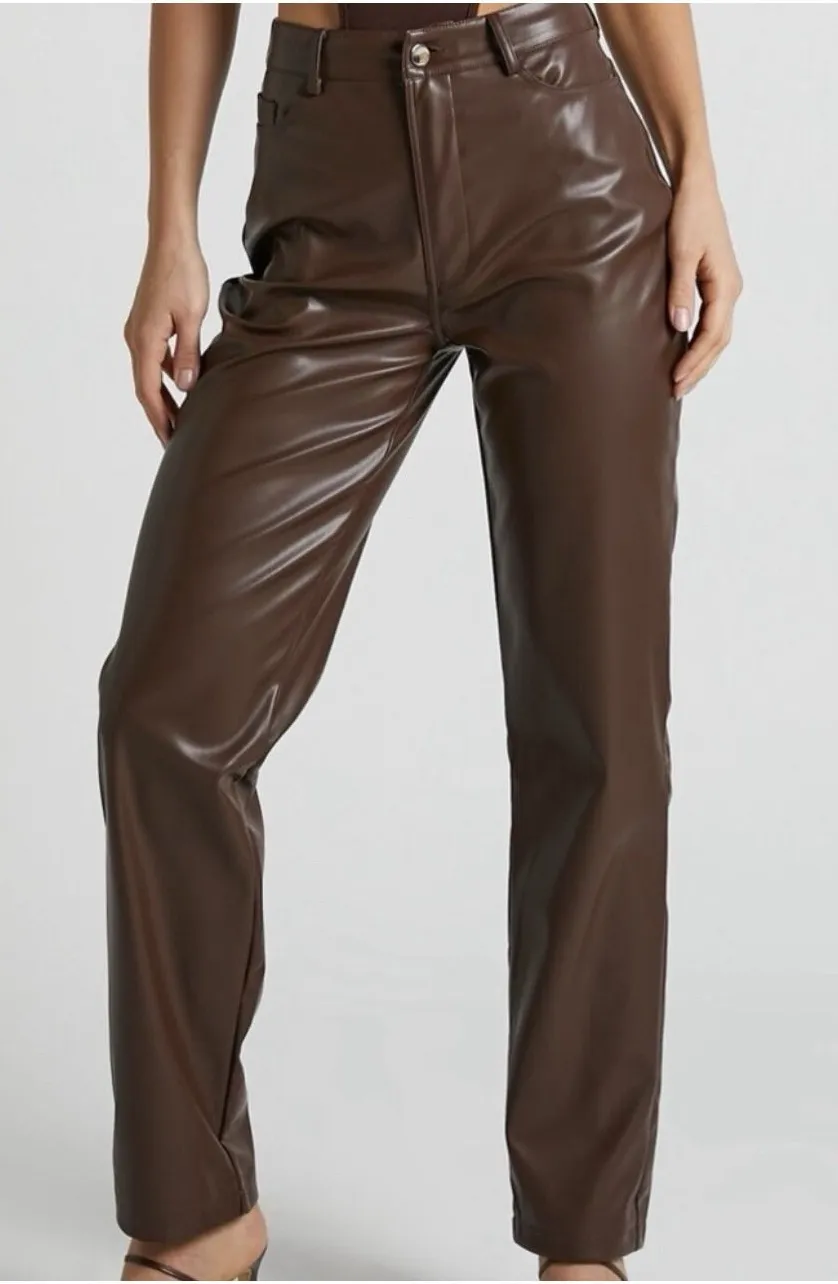 Measurements: Waist 13 Rise 11 Inseam 32 Leg opening 7 Product Details • Zip and button fastening • High rise waist • Belt loops • Straight leg • Faux leather finish No lining Five pockets Material & Care Made with 50% PU, 50% polyester, low stretch Wash with similar colours, wash inside out, cool iron it required, iron on reverse