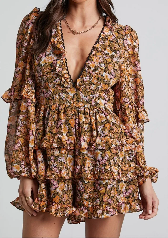 Showpo Liadi Playsuit Jumpsuit longsleeve plunge playsuit Black Floral Sz 8 Size 8 New without tag Invisible zipper on the centre back Deep V-neckline with embroidered detail and ruffle trim Elasticated puff sleeves with ruffle detail Tiers of ruffles on shorts Fully lined excl. sleeves No pockets