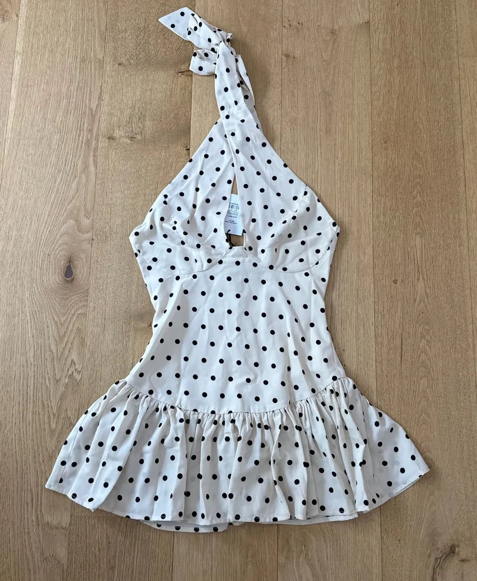 Showpo Mini Dress Keyhole Halter Polka Dot Size US2 Cream Black GS1225-D26 Size : US 2 Color : Cream Black Condition : NWT Halter neck Adjustable tie on the neck No padding in bra