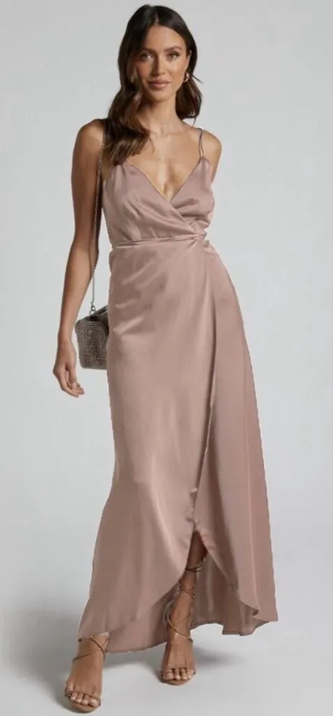 Elegant satin slip dress. Features a draped front. Spaghetti straps for a delicate look. Snag on the backside, see pics **Stock photo colors are not exact - for style reference onlyt* Perfect for summer weddings or for a bridesmaid Tags-wedding, wedding guest, Bridal, fall, spring, summer, winter, rust, bronze, silk, satin, slip dress, Hi low, maxi length, midi length, V-neck, spaghetti strap, sexy, dressy, BoHo, western, girly, feminine, shiny,
