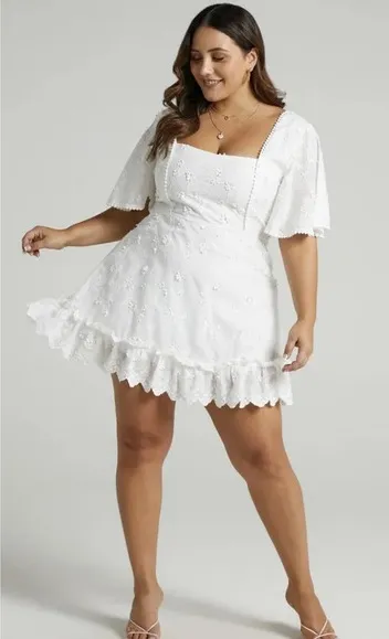 Size 12 US from Showpo. Style name Fancy A Spritz. White lightweight cotton floral embroidered mini... Show more