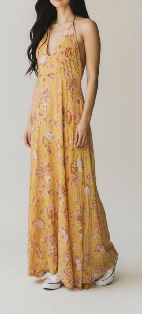 lined flowy halter neck open back plunging neckline with babydoll style top women's 8 100% viscose laying flat measures 15" waist, 54" top to bottom - but very stretchy bohemian, boho, cottagecore, babydoll