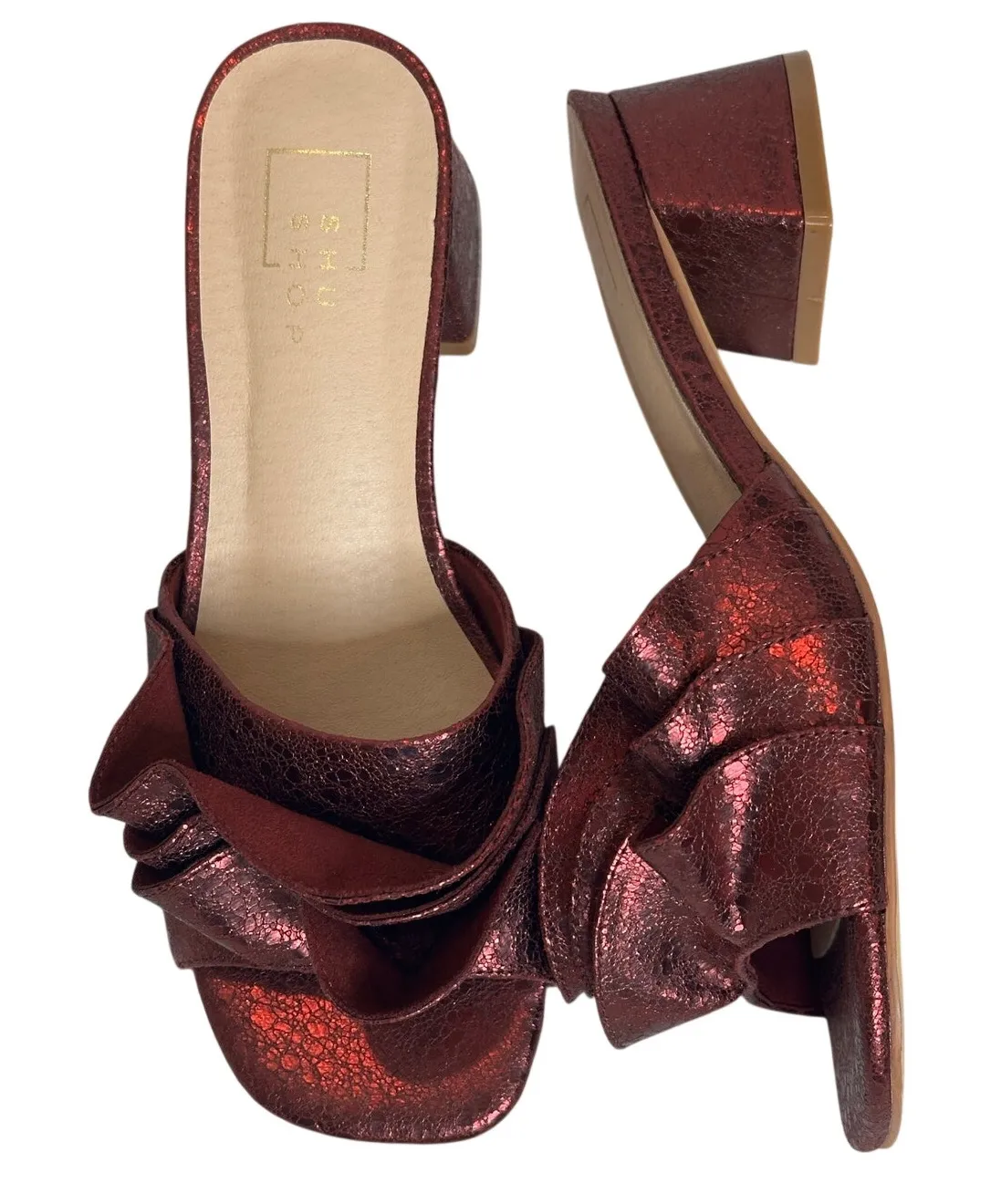 Shu Shop Frances wine color brocade ruffle block heel mules size 7 Brand New without/box/tags. MS... Show more
