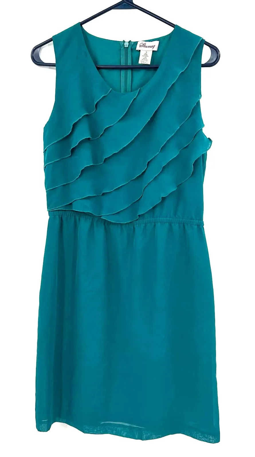 Shumaq size small sleeveless dress lined teal - blue green color silk blend ruffle detail on chest fitted elastic waist hidden rear zip small mark near neckline - please see fifth photo