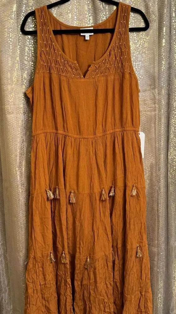 Shyanne Cognac Rust Orange Brown Western Maxi Dress XL NWT Brand new with tags, smoke and pet free home. No flaws, just needs a good de-wrinkle. Beautiful Fall color called Cognac, like a rust orange brown color. This dress is a bold statement of contemporary design infused with timeless Western charm. It can be a Midi or Maxi dress depending on your height, see measurements below. Sold out online. The smocked bodice provides a snug yet flexible fit, adding a delicate texture and shaping that flatters all body types. It transitions smoothly into the skirt, creating a harmonious silhouette. Adorned with metallic gold infused tassels. 100% Rayon Sleeveless Split neck Smocked Tiered Solid pattern Hang dry Pit to pit laying flat across approx: 21” Top of shoulder to bottom hem approx: 49” Waist laying flat across approx: 17”