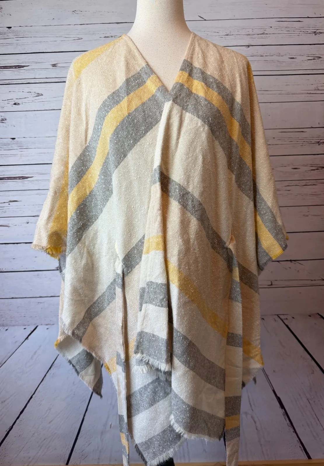 Shyanne Country Wear Neutral Striped Cape Shawl Knit Cardigan Womens Boho Poncho Blanket Chic 100% Acrylic Hand wash Belted with fringed trim / frayed edging. Beige gray and yellow striped in color. Made in China CMFA1283 PO 388087 Perfect for the country western cowgirl rodeo ranch farmer horseback riding horse outdoors adventure Great NWOT New without tags condition OSFA One Size Wear It Mean It 6480.c375.20251031 30