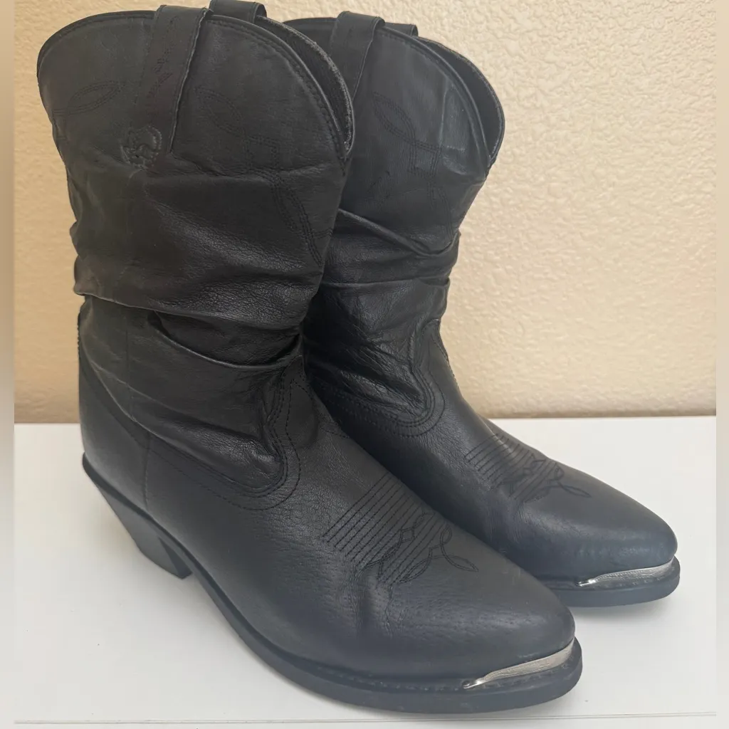 The Shyanne Slouchy Hairress Black Boots in women's size 11 feature a pointed toe and a pull-on closure for easy wear. With a mid-rise shaft and mid-heel height, these Western-style boots are perfect for a variety of occasions including travel, parties, and casual outings. Made of leather with a comfortable insole and outsole, these boots are durable and stylish. The black color and solid pattern make them versatile for all seasons, while the block heel adds a trendy touch to your outfit. Perfect for those who enjoy a touch of Western flair in their footwear. - See all pics for any wear. these are in pre-owned condition - From Smoke Free Environment - Item shown the exact item you will receive. ** Be sure to Follow us, We post new items 3-4 days a week. **SHIPS FROM Salinas California**