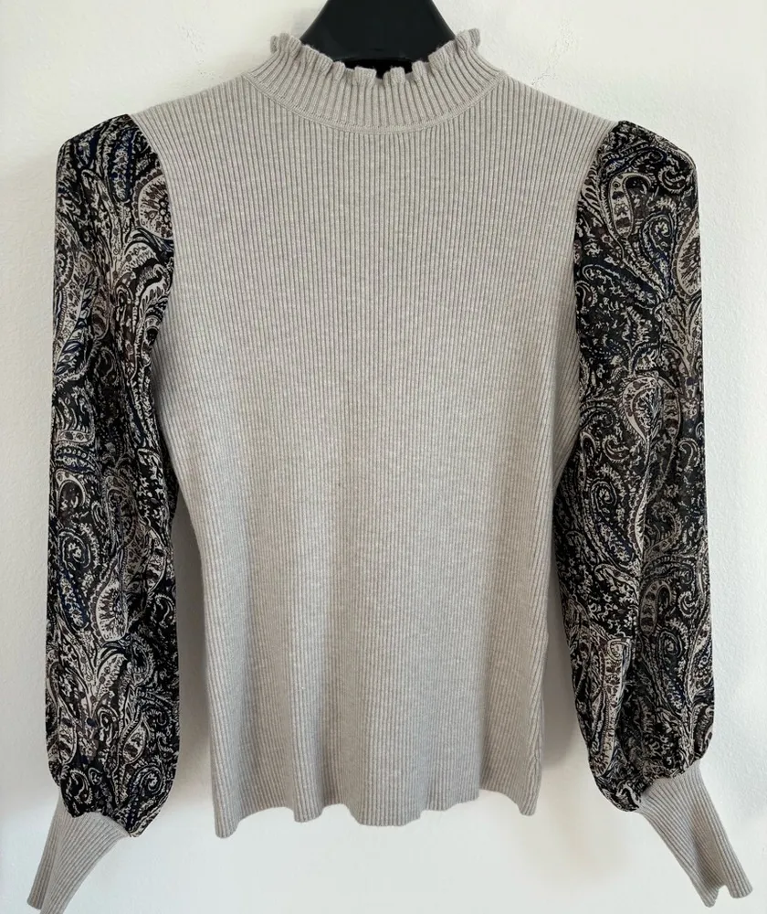 - Brand: Siani Milano - Size: Women's Small - Color: Cream - Details: Sheer Paisley Sleeves, Mock Neck, Ribbed - Condition: Excellent Pre-Owned - Romantic, Preppy, Luxury, Quiet Luxury, Career, Workwear