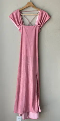 Siedres Blake Pink Sparkly Strappy Lace Up Square Neck Cap Sleeve Slit Maxi Dress. Front slit. Lace up back with adjustable ties. Zipper closure. Size 40 (US Large). Excellent pre-owned condition, no major flaws to note. Approximate measurements: Pit to pit: 13.5“ Length: 51“ Q2.