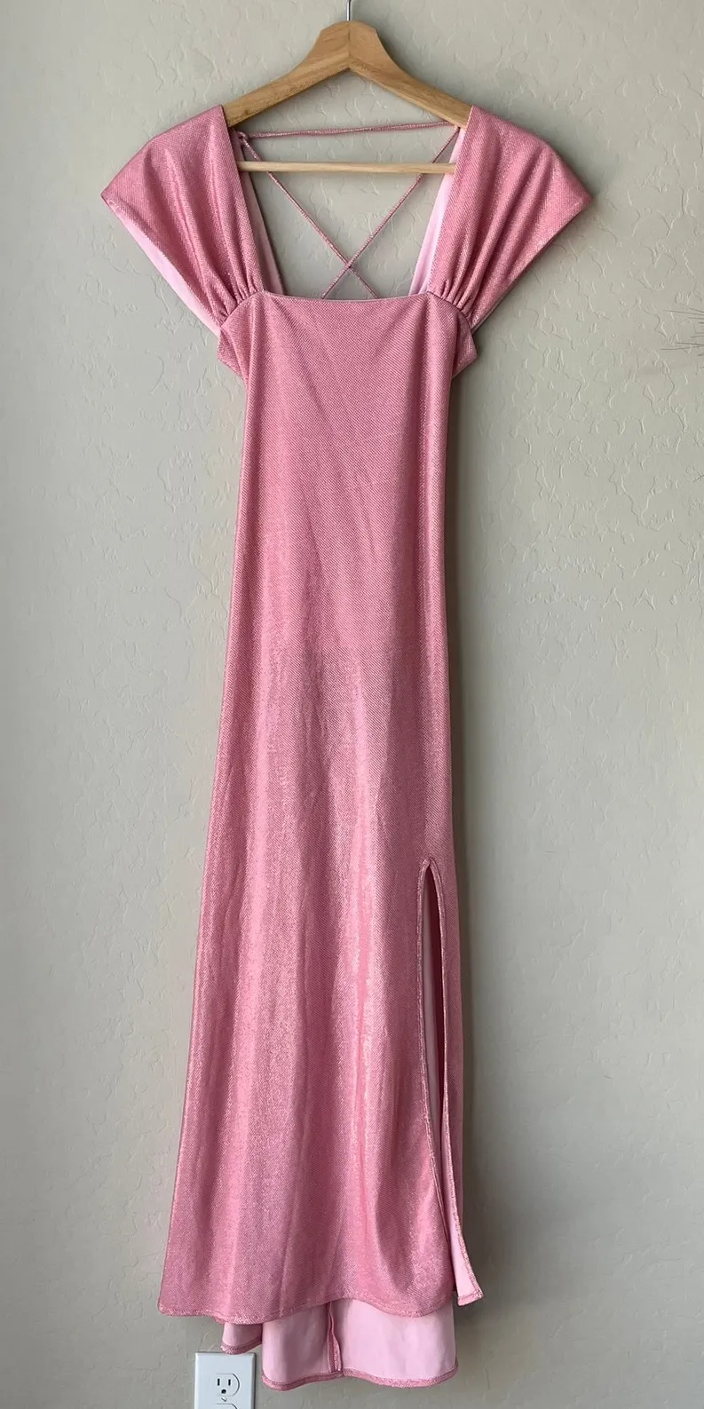 Siedres Blake Pink Sparkly Strappy Lace Up Square Neck Cap Sleeve Slit Maxi Dress. Front slit. Lace... Show more