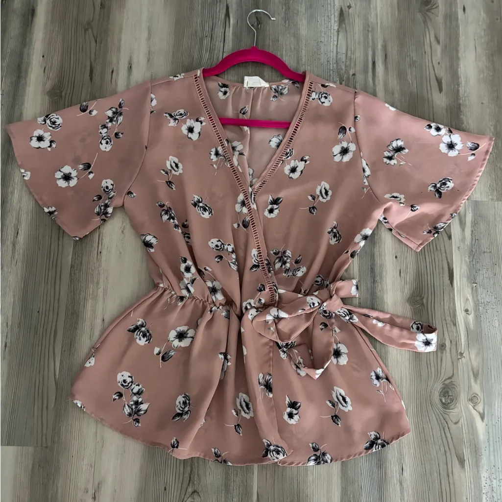 Chic floral wrap blouse with a flattering tie waist. Soft mauve color enhances elegance.
