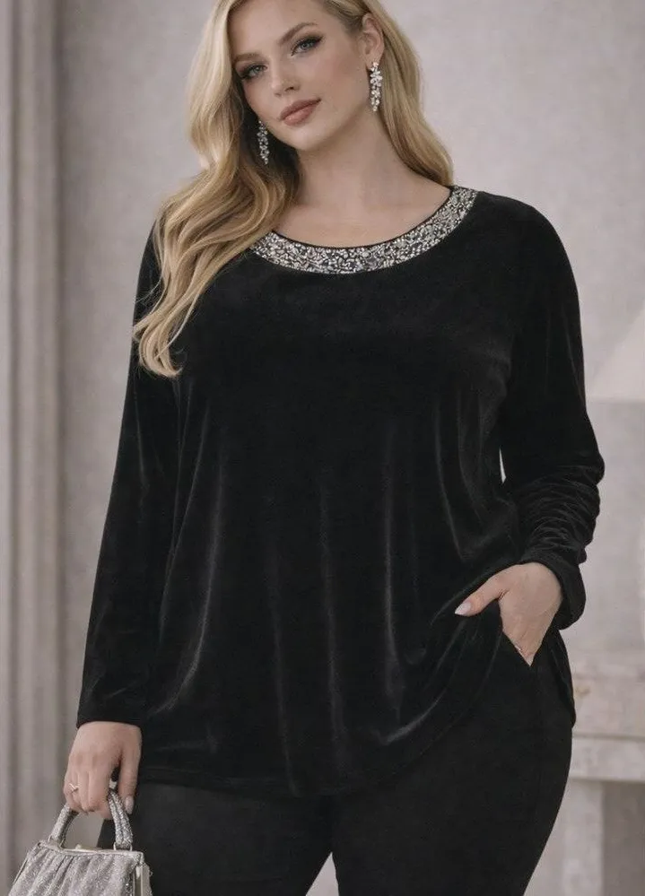 Signature Collection sweater top in classic black, size medium. Crafted from soft velour velvet, this elegant top features a relaxed silhouette accented by a sparkling rhinestone-embellished neckline that adds a refined touch of glamour. The long sleeves and fluid drape make it comfortable yet polished, perfect for evening events, holiday gatherings, or elevated casual looks. An easy statement piece that pairs beautifully with tailored pants or skirts. • Brand: Signature Collection • Style: Velour velvet sweater top • Color: Black • Neckline: Round with rhinestone embellishment • Sleeves: Long sleeve • Size: Women’s medium evening chic, understated glamour, velvet luxe, holiday style, elegant casual, polished, timeless