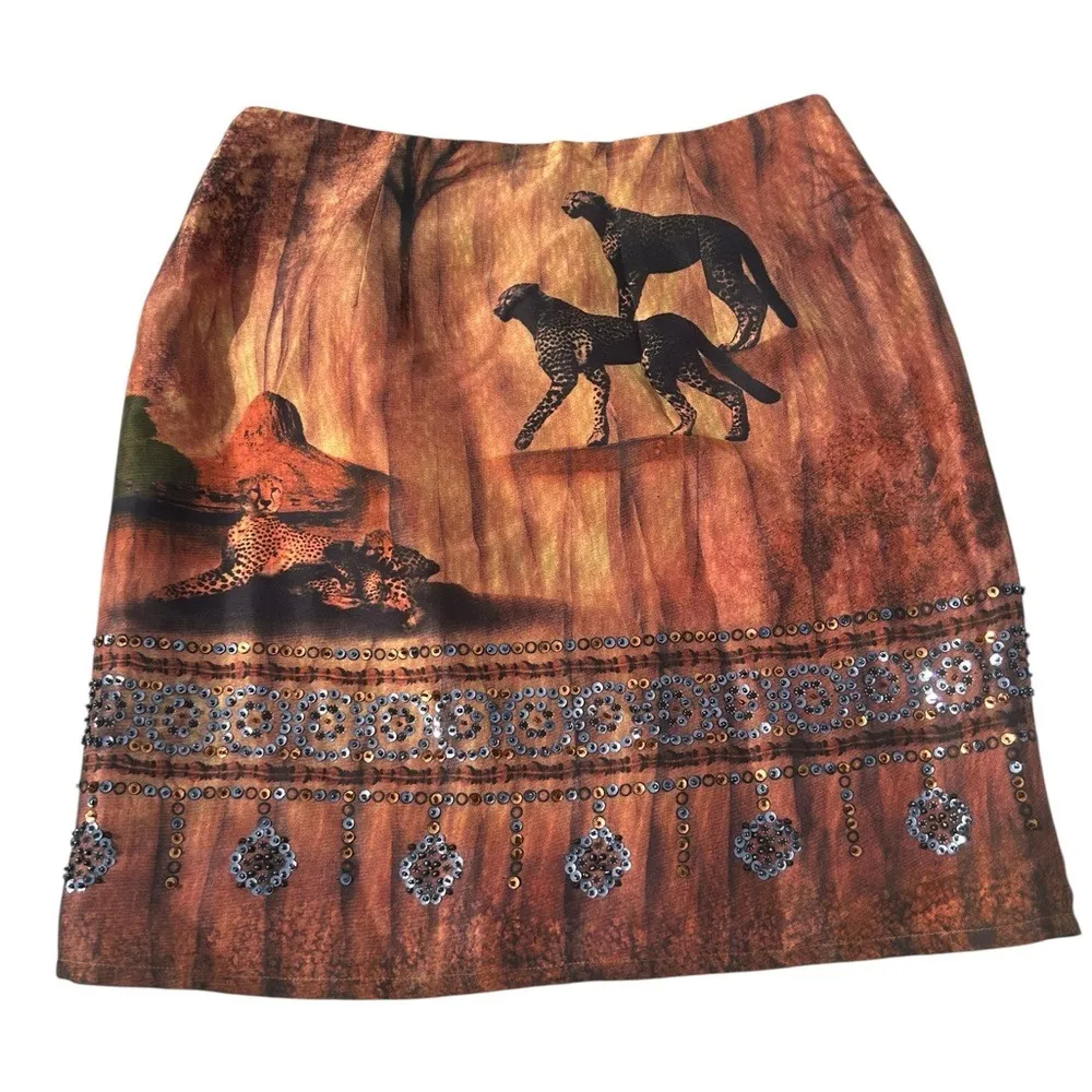 Unleash your inner wildcat with this eye-catching skirt! A mesmerizing animal print sets the stage for adventure, with sleek cheetahs prowling across a vibrant, earthy backdrop. Delicate sequin embellishments add a touch of sparkle and glamour, elevating this piece from simply stylish to show-stopping. This skirt is perfect for a night out, a gallery opening, or any occasion where you want to make a bold and unforgettable statement. Measurements: • Length: 20 inches • Waist: 14 inches Type: Skirt Style: A-Line Skirt Length: Knee Length Department: Women Pattern: Animal Print Material: Silk, Acetate Accents: Sequin Fabric Type: Satin Features: Lined Character: Jungle Girl Theme: Animals, Leopard, Bohemian, Nature Closure: Zip Rise: Mid Occasion: Party/Cocktail, Casual Keywords: Silk Club Petite, Silk Skirt, Cheetah Print, Animal Print Skirt, Sequin Skirt, Petite Skirt, Vintage Skirt, Bohemian Skirt, Party Skirt, Silk Clothing, Womens Skirt, Size P/8