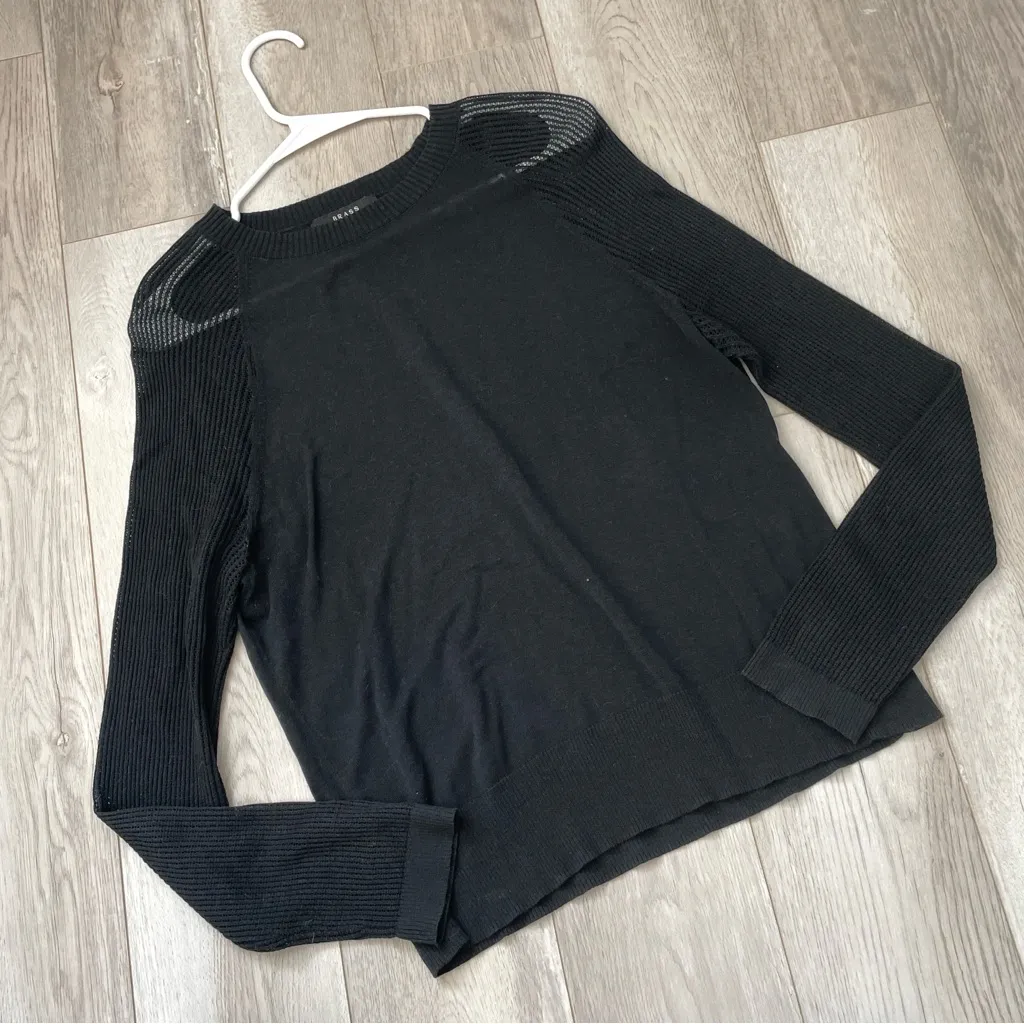Silk Cotton Lightweight Crewneck Sweater in the color Black. Crew neckline, long semi-sheer striped sleeves, regular length. Lightweight, breathable, knit fabric. Size medium, womens. In great pre-worn condition, no major issues. 55% silk, 45% cotton. Super cute classic, minimalist, edgy, casual, contemporary style. Brand is Brass. //D38, 5.1