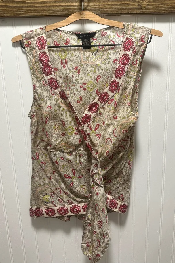 This elegant sleeveless blouse from SilkLand features a chic wrap design with a tie front, showcasin... Show more
