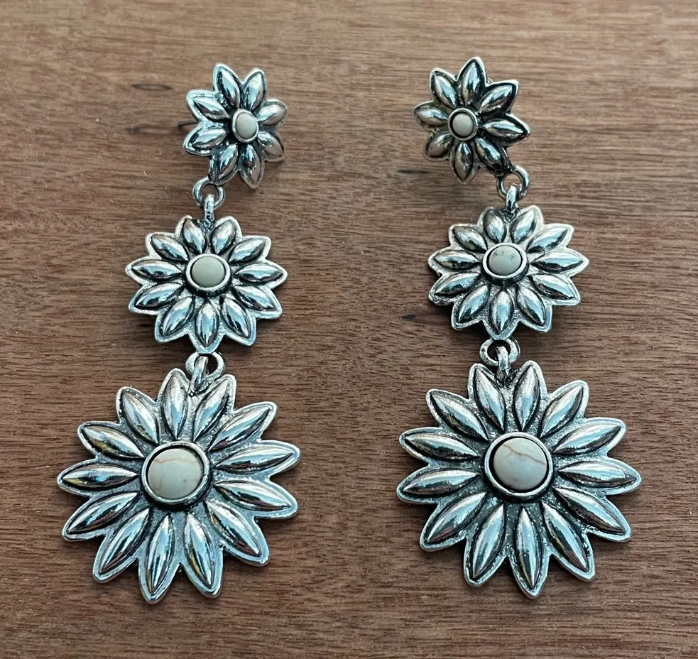 **Some scratches on the white accents** • Super cute drop earrings with three flowers. • White center details. • Post and backing. • Brand new. 💌 Ships same or next business day! 🛍️ Huge Selection, Bundle & Save! 🌵 Let me know if you have any questions! 🌎 10+ Years Experience ↪️ western, southwestern, boho, festival, cowgirl, western jewelry, bohemian, cowboy, rodeo, country, southwest, western wear, boutique, new, new with tags, jewelry, unique jewelry