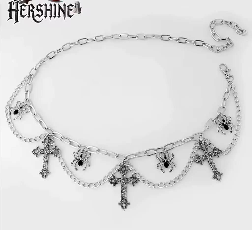 Elevate your style with the Silver Gothic Necklace. Featuring intricate cross and spider charms, this piece adds a bold statement to any outfit. Y2K silver spider cross chain decoration dark style waist chain clothing accessories Halloween accessorie