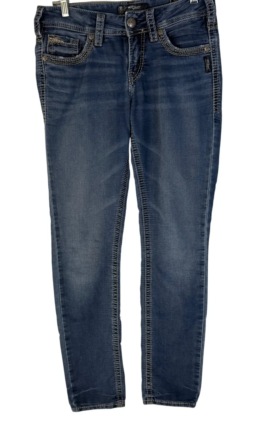 Style: Skinny Department: Women Fabric Wash: Medium Waist Size: 28 in Accents: Embroidered Type: Jea... Show more