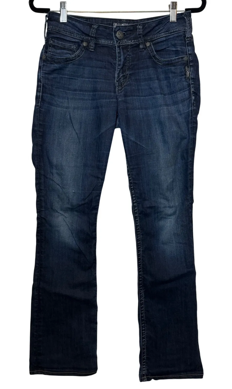 Embrace timeless style and comfortable confidence in these Silver Jeans Co. Suki mid-rise bootcut jeans. Crafted to flatter your silhouette, their dark wash denim offers a sleek and versatile look that transitions effortlessly from day to night. The subtle whiskering and fading add a touch of lived-in charm, while the signature stitching on the back pockets provides a distinctive designer touch. Experience the perfect blend of classic design and modern comfort, ideal for a casual brunch with friends or a relaxed evening out. Measurements: • Waist: 28 inches • Inseam: 33 inches Style: Bootcut Department: Women Fabric Wash: Dark Waist Size: 28 in Accents: Button, Logo Type: Jeans Features: Pockets, Distressed Fit: Classic Pattern: Solid Rise: Mid (8.5-10.5 in) Fabric Type: Denim Inseam: 33 in Material: Cotton Blend, Polyester, Spandex Closure: Button, Zip Keywords: Silver Jeans Co, Suki Jeans, Womens Jeans, Mid Rise Jeans, Bootcut Denim, Dark Wash Jeans, Designer Jeans, Casual Pants, Comfortable Denim, Everyday Wear, Versatile Jeans, Classic Denim, Fashionable Jeans, Size 28, Size 33