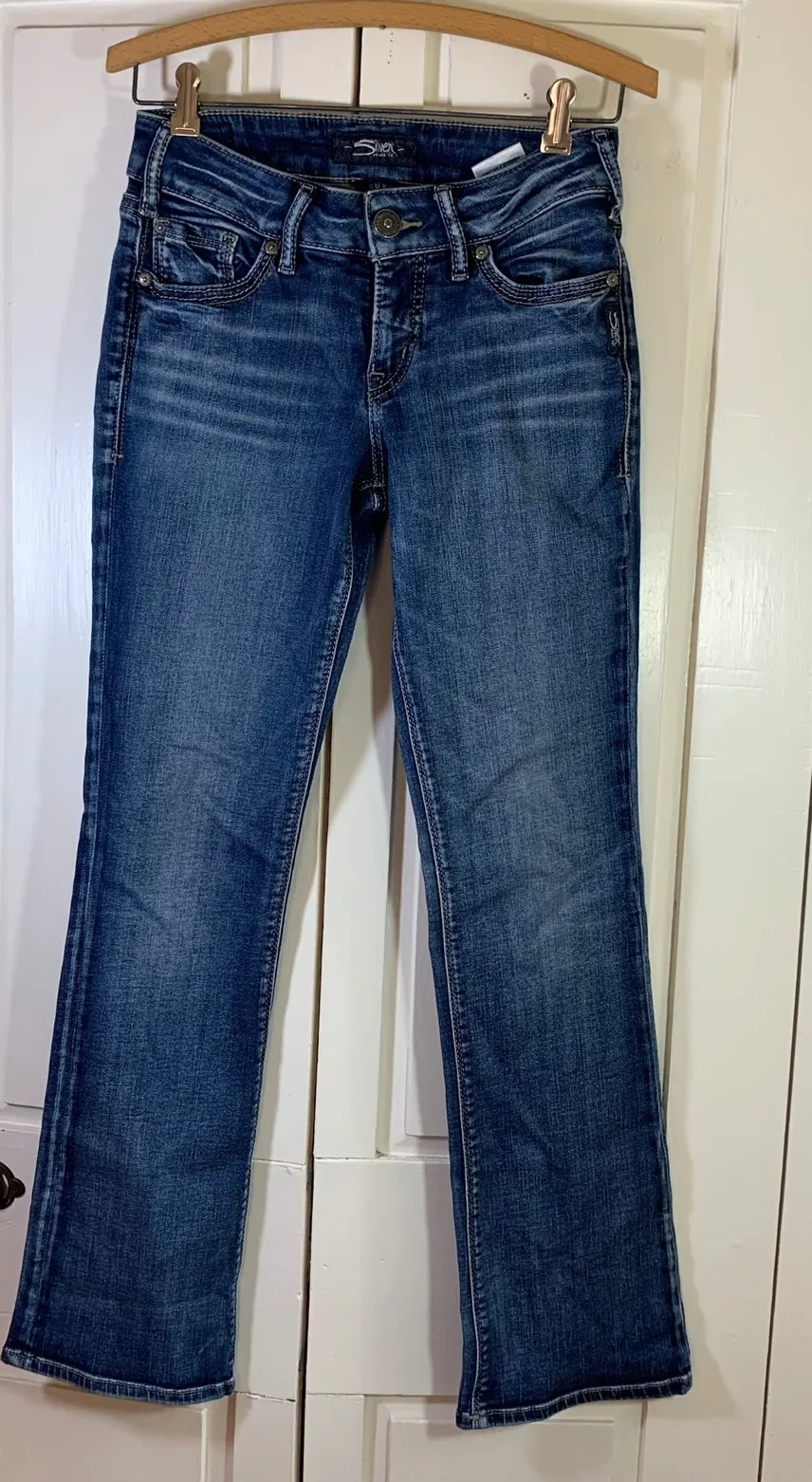 Silver Jeans Co. SUKI Slim Bootcut Denim Jeans Womens Size 27/31 Actual ins 30" Stylish and flattering denim jeans offering a classic bootcut silhouette. Featuring a comfortable mid-rise waist and a slim fit through the hips and thighs, these jeans provide a sleek and streamlined look. The dark wash denim is accented by subtle fading and whiskering for a lived-in feel. Classic five-pocket styling offers practicality, while the signature Silver Jeans Co. details on the back pockets add a touch of western flair. These jeans are perfect for everyday wear, casual outings, or dressing up for a night out. Style: Bootcut Color: Blue Department: Women Type: Jeans Fabric Wash: Dark Accents: Button, Logo Features: Pockets, Slimming, Mid-Rise, Five-Pocket Design, Comfortable Fit Fit: Slim Pattern: Solid Fabric Type: Denim Keywords: Silver Jeans, SUKI, Slim Bootcut, Bootcut Jeans, Womens Jeans, Denim, Mid Rise, Dark Wash, Casual Jeans, Five Pocket, Silver Jeans Co
