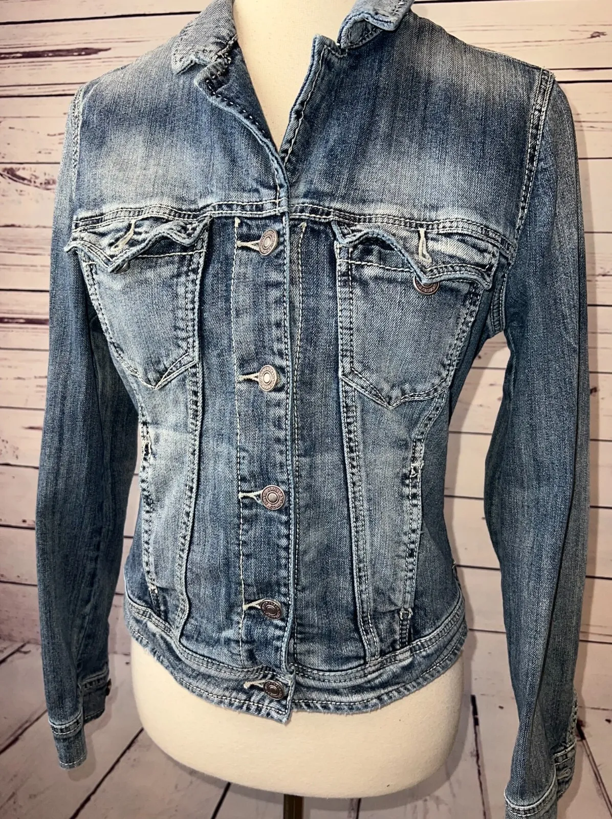 Silver Jeans Denim Jacket size Small Trucker Jean Coat Distressed washed and worn look Y2K 90s Long sleeve, button front, two front pockets with flap closure. Made in China 82% Cotton 17% Polyester 1% Elastane. Inner material tag is is worn and difficult to read as pictured. Pit to end of sleeve 18", pit to pit 19", back bottom of collar to bottom of trucker coat 19". Adjustable back strap closure. Great preowned condition with no rips or stains. Distressed and washed look by design Perfect for date night out dressed up or down casual homecoming dress cover up. Country Western cowgirl jean. 5127.c5.20250404 30