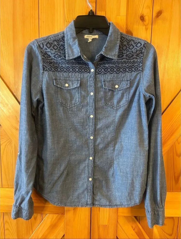 Silver Women’s Western Denim Shirt. Medium Wash. Has embroidered detail, pearl snap buttons, chest p... Show more