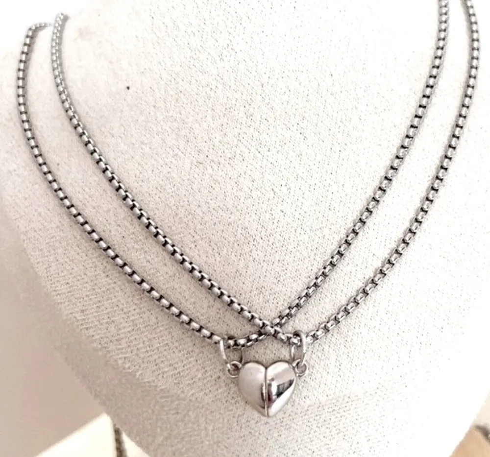Stainless Steel 2pcs Couple Magnetic Heart Charm Necklace Silver plating on Stainless steel • Tarnish Resistant • Hypoallergenic/Nickel and Lead Free •Will it tarnish? No! Our jewelry is made from high quality materials and will last many years. •is it hypoallergenic? Absolutely! The silver finish is entirely safe to wear. •Is stainless steel a good quality jewelry? Jewelry made does not tarnish or bend, it possesses the hypoallergenic nature, ensuring jewelry doesn’t turn your skin green or cause any allergic reaction, making it the ideal option for people who enjoy living active lifestyles. Tags: Men’s necklace Lover necklaces jewelry Anniversary Father's Day Mother's Day Valentine's Day Anniversary