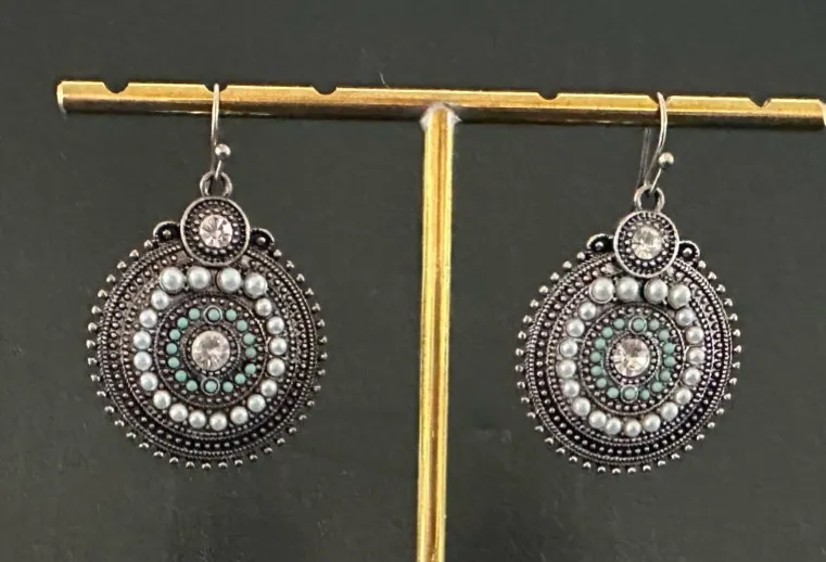 (#227)-Bohemian silver dangle earrings with combination of clear rhinestones, small white faux pearls, and small turquoise-colored beads. Excellent condition. Please refer to the photos for more information and details. ☀️You’re more than welcome to send an offer🌙