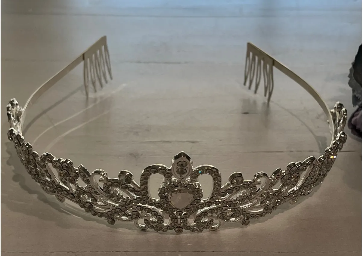 Elegant silver tone tiara featuring intricate rhinestone detailing. This beautiful headpiece is designed with a classic crown shape, adorned with sparkling rhinestones that catch the light. It includes built-in combs on each end to ensure a secure and comfortable fit. The tiara is perfect for adding a touch of regal charm to any special occasion. Keywords: tiara, crown, headband, rhinestone, silver, bridal, wedding, princess, hair accessory, comb, pageant, prom, formal, headpiece