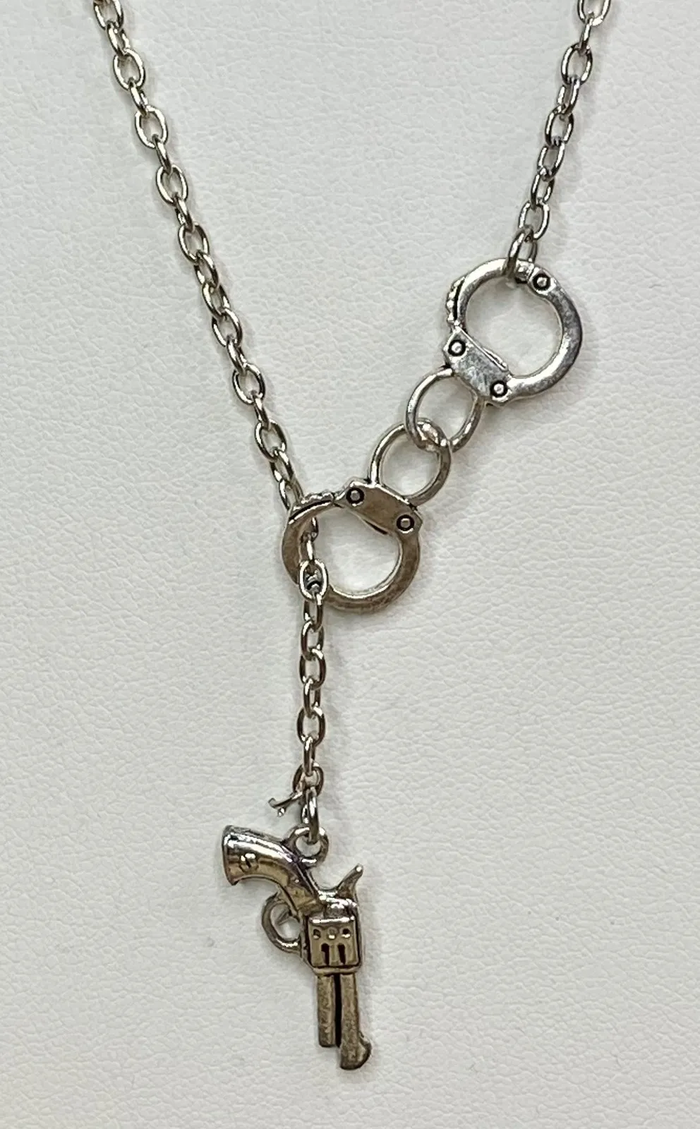 Make a statement with this striking silver tone Y necklace, designed to capture attention and express your unique style. The delicate chain artfully drapes, culminating in a charming handcuff detail that leads to a captivating revolver pendant. This piece adds a touch of edgy sophistication to any ensemble, perfect for elevating your everyday look or adding a bold accent to a night out. Measurement: 21 inches Condition: New Style: Y-Drop, Pendant, Chain, Charm, Layered Type: Necklace Theme: Western, Signs & Symbols, Military Metal: Zinc Alloy Pendant/Locket Type: Charm Chain Type: Cable 229
