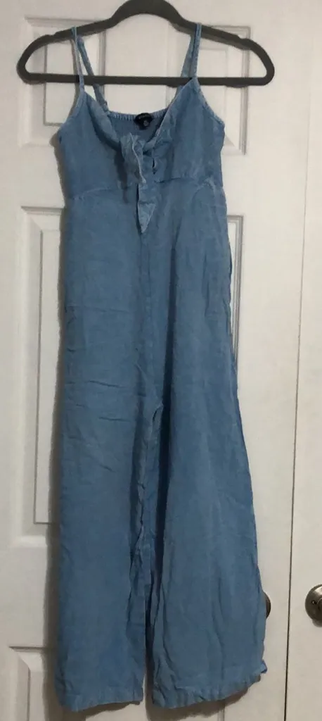 Sim & Sam denim color jumpsuit wide leg women’s size XS concert festival summer. Preowned in fair condition has some light purplish color transfer which is not very noticeable as shown in pics Tie front elastic back Pit to pit 14” across Length 47” Wide leg opening 10” across Needs a steam for wrinkles Fun y2k boho hippy loungewear vibes perfect for city casual beach party club festival