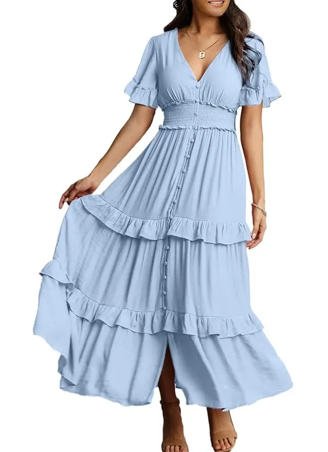 Simplee Size Large L Blue V-Neck Tiered Ruffle Hem Smocked Waist Maxi Dress Good, Pre-Owned Condition Size: Large Brand: Simplee Color: Blue Pullover closure Short sleeves with ruffle details V-neck Faux button front details Maxi length Tiered ruffle hem Smocked waist 100% Polyester