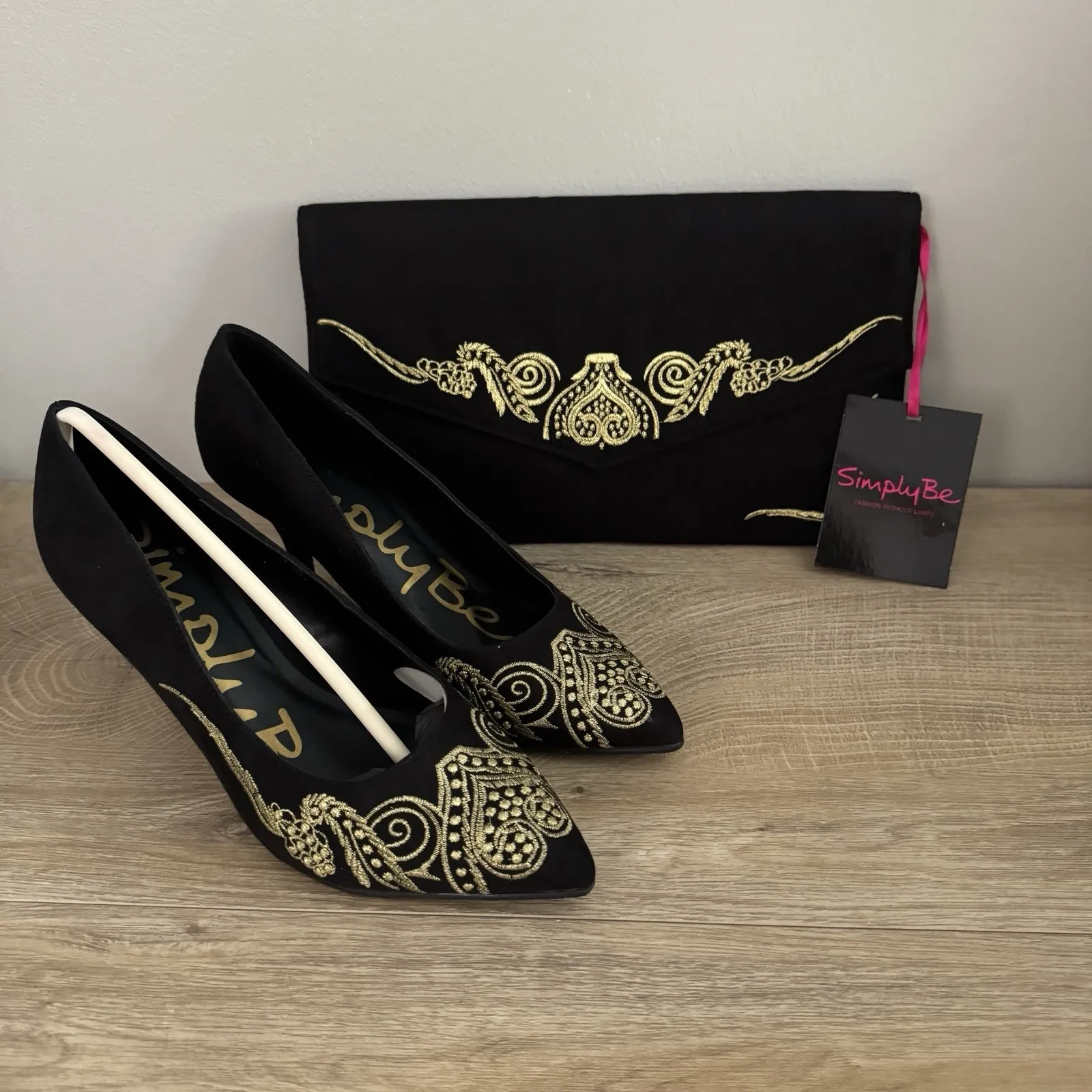 Simply Be Black Gold Embroidered Heels Clutch Set Womens 7 Party Wedding Guest wedding guest, formal shoes, evening bag, prom outfit, matching set, black heels, embroidered pumps, party shoes, clutch bag set, gala, cocktail attire, statement heels, gold detailing, holiday party, special occasion, vintage inspired, elegant style, occasion wear, date night, standout look New without Box. Please see photos for measurements, condition and details. All items are shipped promptly.