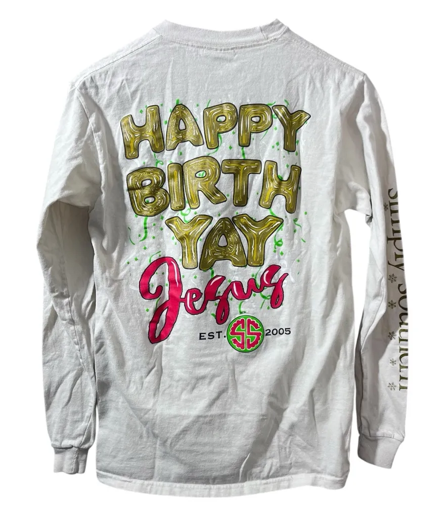 Super cute Happy Birthday Jesus graphic on back of beige shirt. Shirt is in excellent condition over... Show more