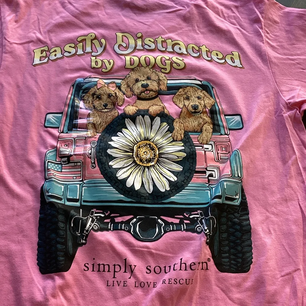 Simply Southern “Easily Distracted by Dogs” Pink Tee with Dogs in Jeep Graphic Size Small 💯 cotton... Show more