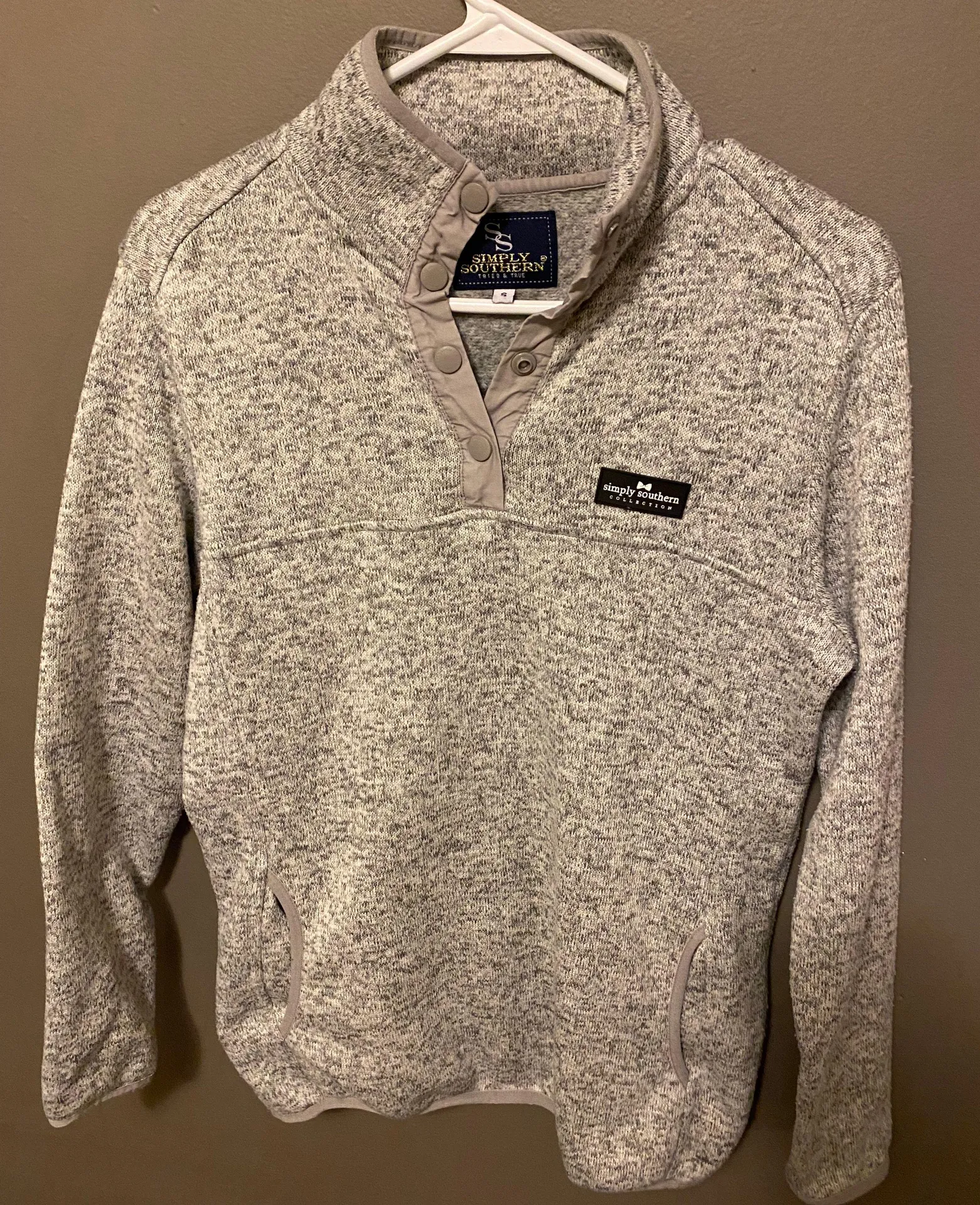Grey quarter button pullover. Very warm, looks super cute with leggings! Worn a few times but is sti... Show more