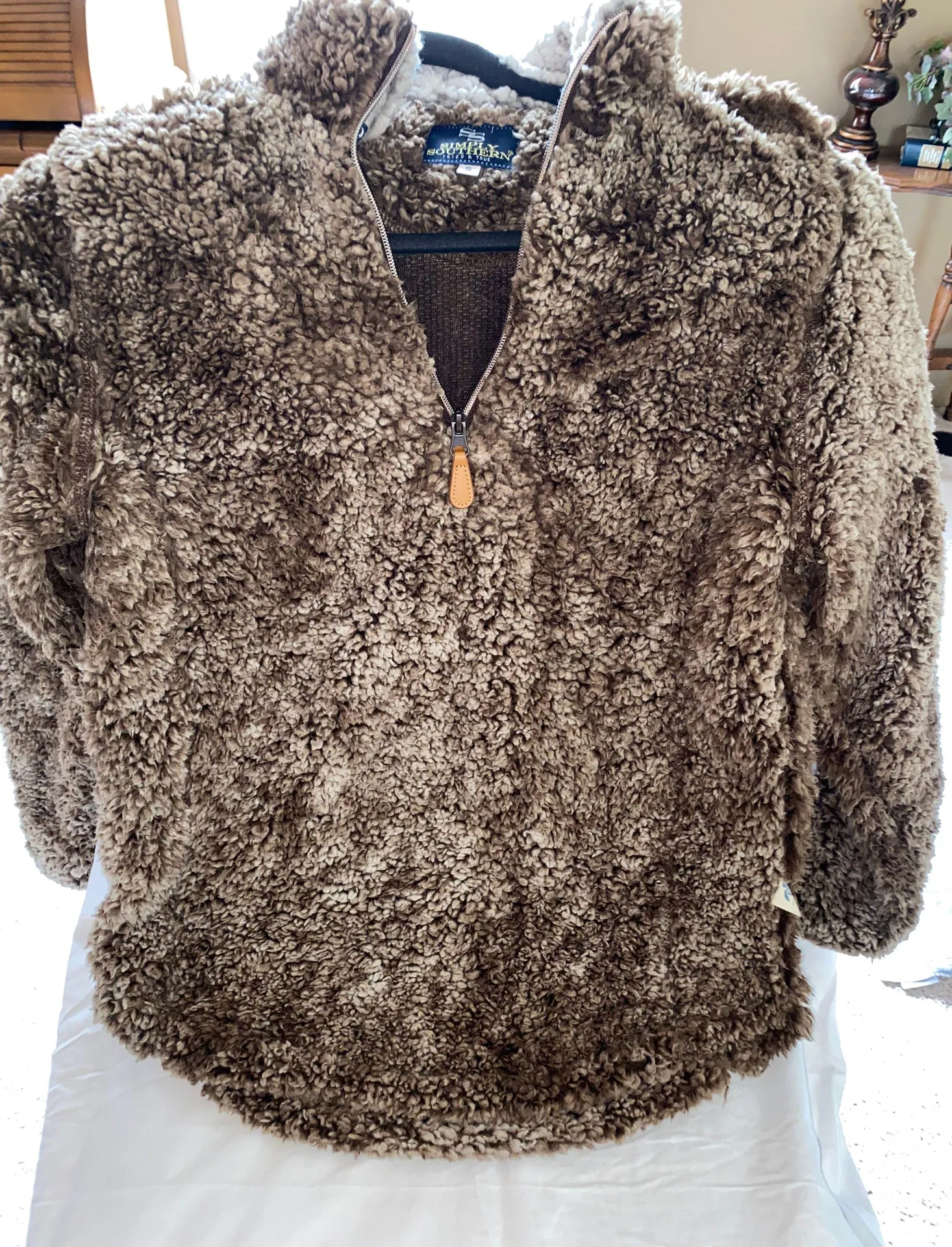 Very warm Sherpa 1/4 zip pullover. It’s multiple colors of browns and creams.
