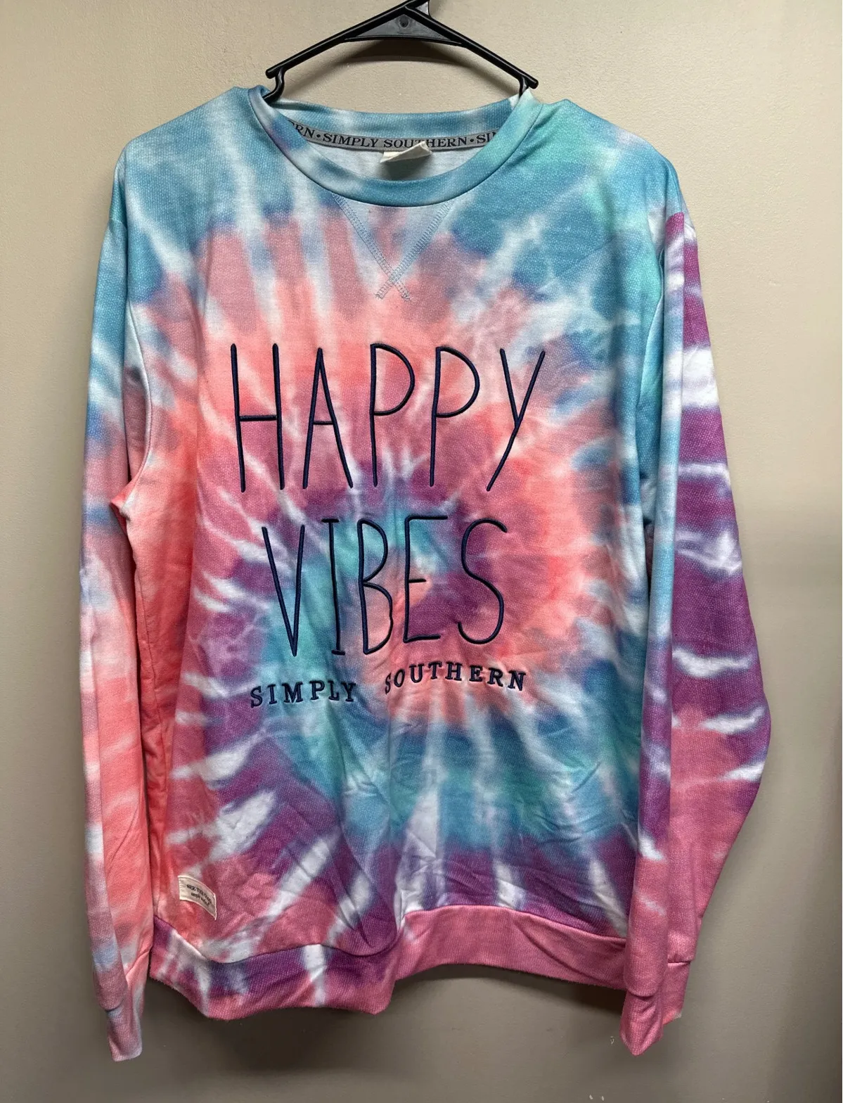 Simply Southern tie dye crewneck sweatshirt with a 'Happy Vibes' graphic. This comfortable long slee... Show more