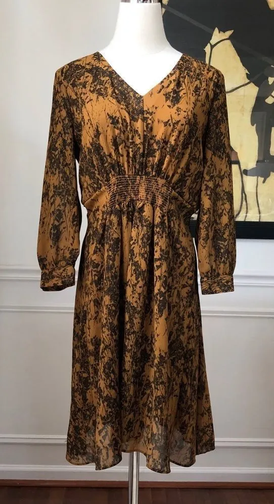 Simply Vera Vera Wang amber color chiffon overlay with black splatter print dress. V neck and long s... Show more