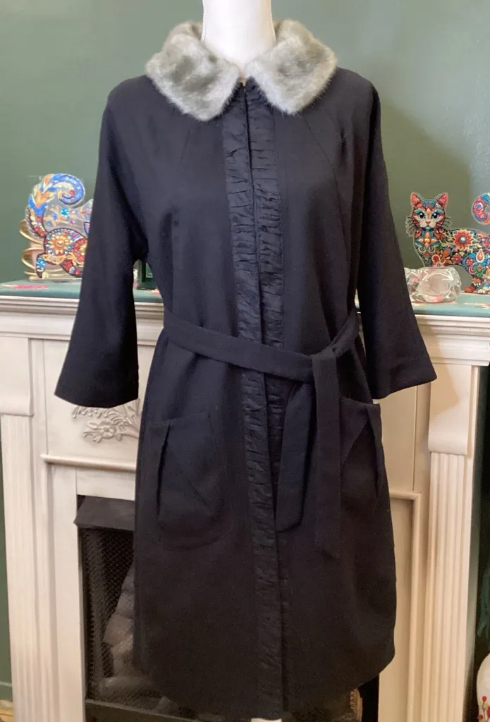 Elegant black trench coat featuring a soft gray faux fur collar. Perfect for stylish outings. Hook a... Show more