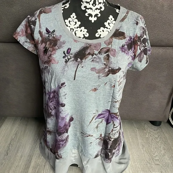 Beautiful SIMPLY VERA VERA WANG Gray Floral T-Shirt Size Petite Medium (PM)! Very good condition! Beautiful sheer trim all around at the bottom, and decorative stones on one side on top! The material tag is missing but it is a light material. Approximate measurements laid flat: - Shoulder to shoulder: 14” - Pit to pit: 18” (Bust 36”) - Length from back collar: 25”
