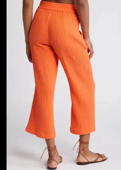 Elevate your wardrobe with these sincerely jules High Rise Gauze Womens Slub Knit Cropped Wide Leg Pants in Orange. The pants are perfect for travel or casual occasions, with a relaxed fit and wide-leg design. The cotton material and knit fabric type ensure comfort, while the tie and pull-on closure add convenience. The pants feature a solid pattern, cropped style, and a waist size of 23 inches, making them ideal for women of all sizes. The beautiful bow accents and vibrant orange color add a touch of bohemian and hippie vibes, perfect for a festival or beach day. The pants are 22 inches long and come in a size small, with a regular size type and wide-leg design.
