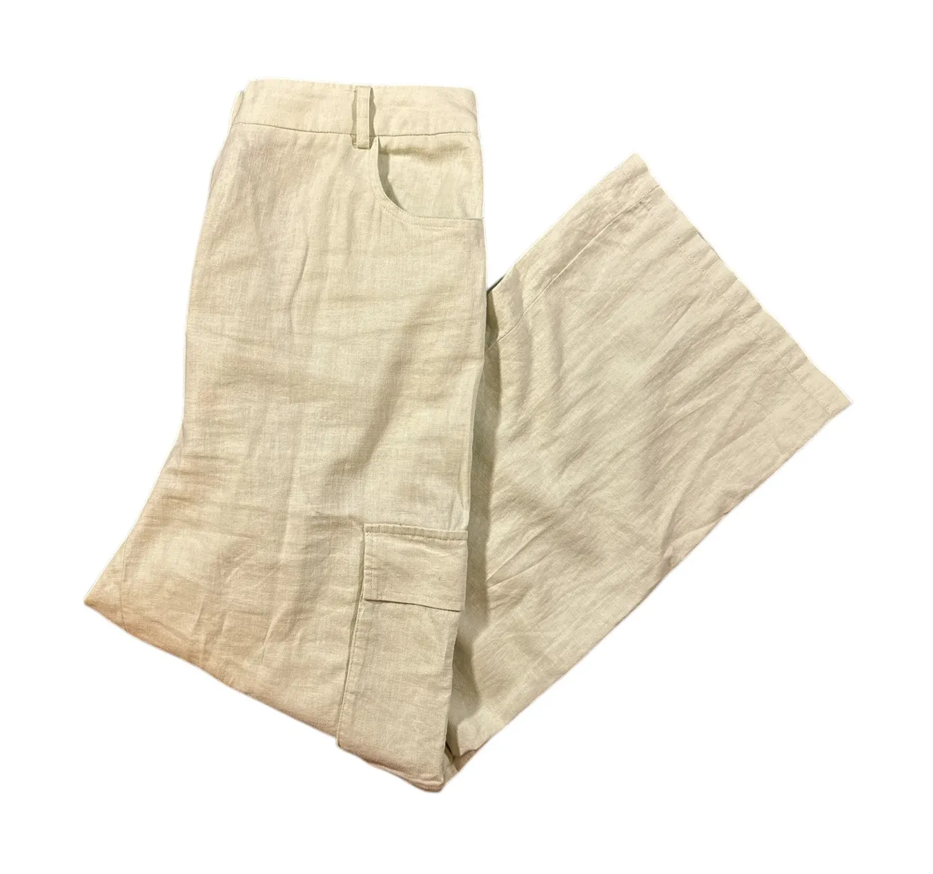 Discover effortless comfort and chic style with these Sincerely Jules cargo pants. Crafted from a breathable linen blend, these pants feature a flattering wide leg silhouette and convenient cargo pockets. The elasticated back waistband ensures a perfect fit, making them ideal for a relaxed yet polished look. Perfect for a casual day out or a stylish vacation ensemble. Measurements: • Waist: 30 in (elasticated) • Inseam: 26 in • Length: 38 in • Rise: 12 in • Leg Opening: 10 in Style: Cargo Department: Women Material: Linen, Rayon, Polyester, Cotton Leg Style: Wide-Leg Type: Pants Fabric Type: Linen Blend Features: Pockets, Lightweight, Breathable, Adjustable Waist Closure: Pull On, Button, Drawstring Pattern: Solid Accents: Button Theme: Beach, Casual Occasion: Casual, Travel Inseam: 26 in Keywords: linen pants, wide leg, cargo pockets, elastic waist, beige pants, casual, vacation, summer, spring, comfortable, stylish, women's trousers