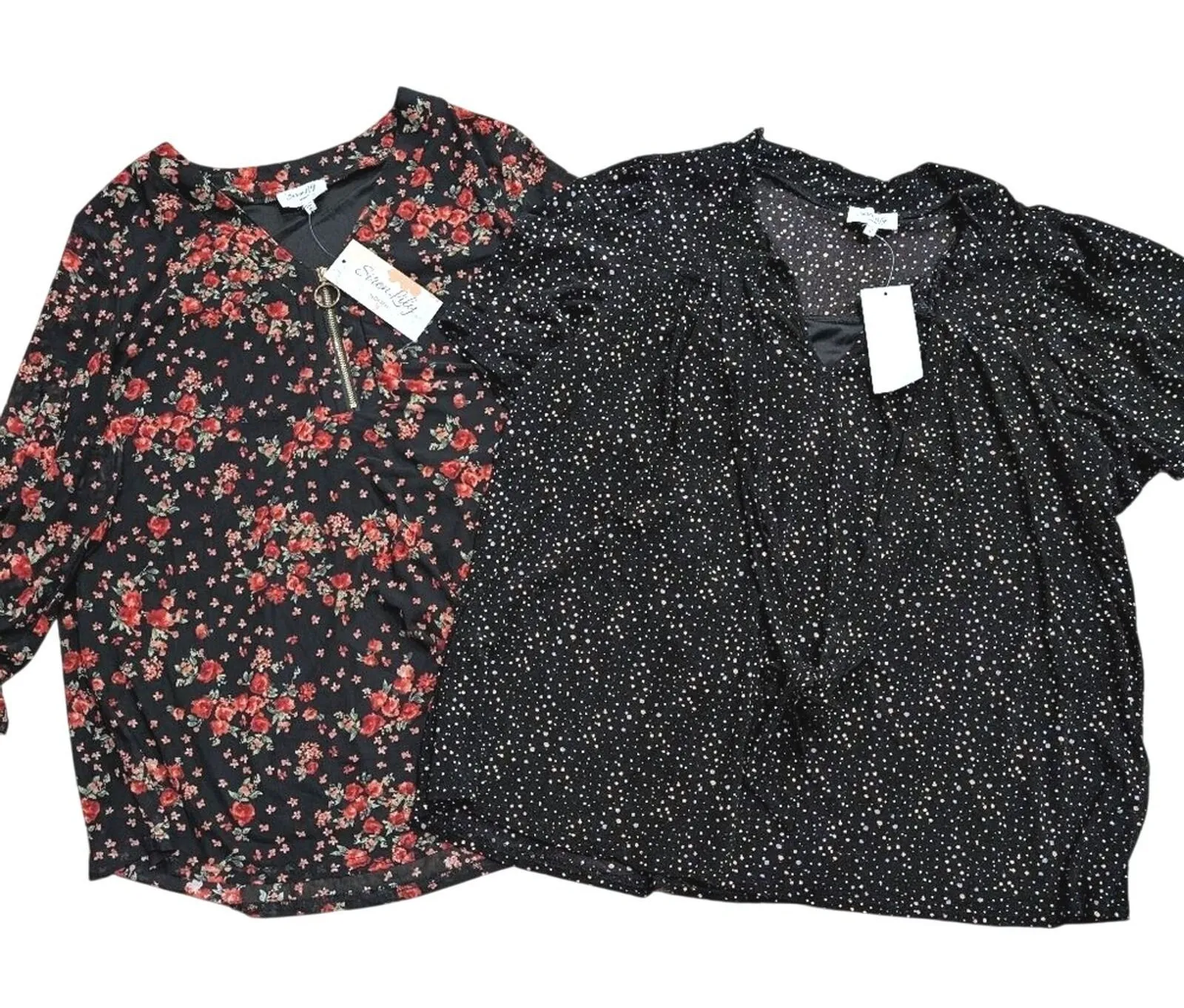 ** Lot of 2 Siren Lily tops! ** BRAND NEW condition! ** Both are Womens Plus Size 1X ** perfect dressy or work wear Black White Dotted Top Bust: 50" Around Bottom Hem: 52" Length: 28" Black Red Floral Top Bust: 48" Around Bottom Hem: 50" Length: 29" Perfect addition to your wardrobe!! Tons more WOMENS AND PLUS SIZE CLOTHES listed!!
