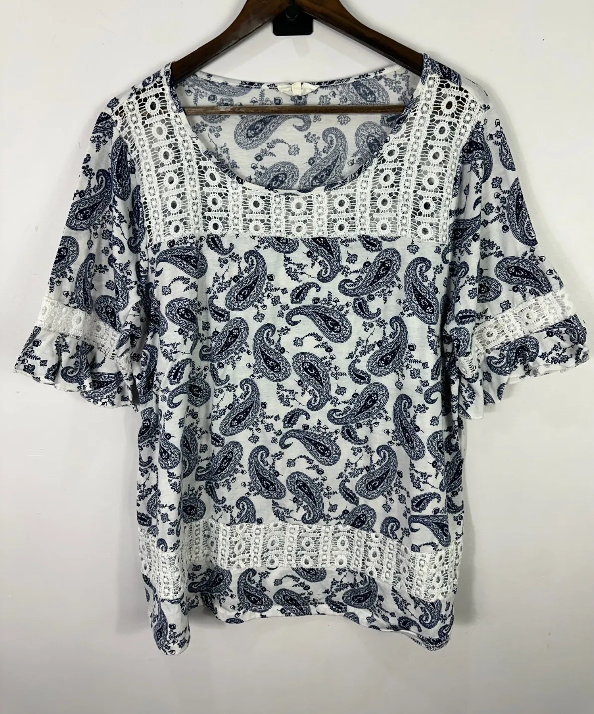 Beautiful Siren Lily women's 2X top featuring a navy blue paisley print on white with intricate eyelet lace trim at neckline, hem, and sleeves. Romantic boho-inspired peasant aesthetic with feminine charm. Lightweight and perfect for everyday wear or layering. Features: * Size: 2X * Color: Blue and white * Pattern: Paisley with lace trim * Style: Boho, cottagecore, romantic feminine * Material: polyester * Square neckline, flutter sleeves, relaxed fit * oho, cottagecore, romantic, soft girl, vintage inspired, peasant, festival, feminine, indie #BohoStyle #Cottagecore #RomanticTop #FestivalFashion #PlusSizeStyle