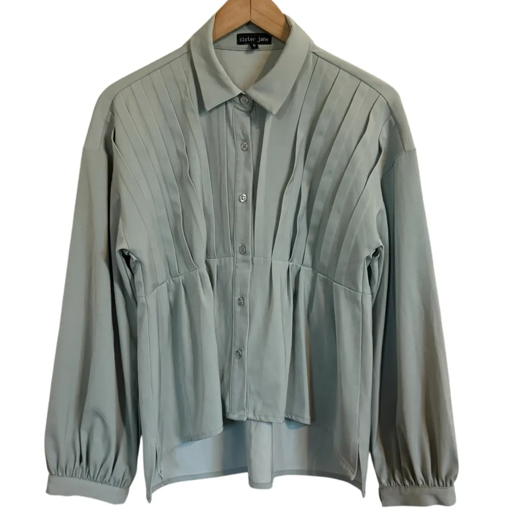 Chic Sister Jane blouse in a soft sage green tone with elegant pleated detailing and a flattering, slightly peplum-style silhouette. Features a button-up front, pointed collar, and long sleeves with gathered cuffs—perfect for workwear, brunch, or elevated everyday style. Details: • Brand: Sister Jane • Size: Women’s Small • Color: Sage green • Long sleeves with elastic cuffs • Pleated front detail • Button-up closure Modern, feminine, and effortlessly polished Great preloved condition