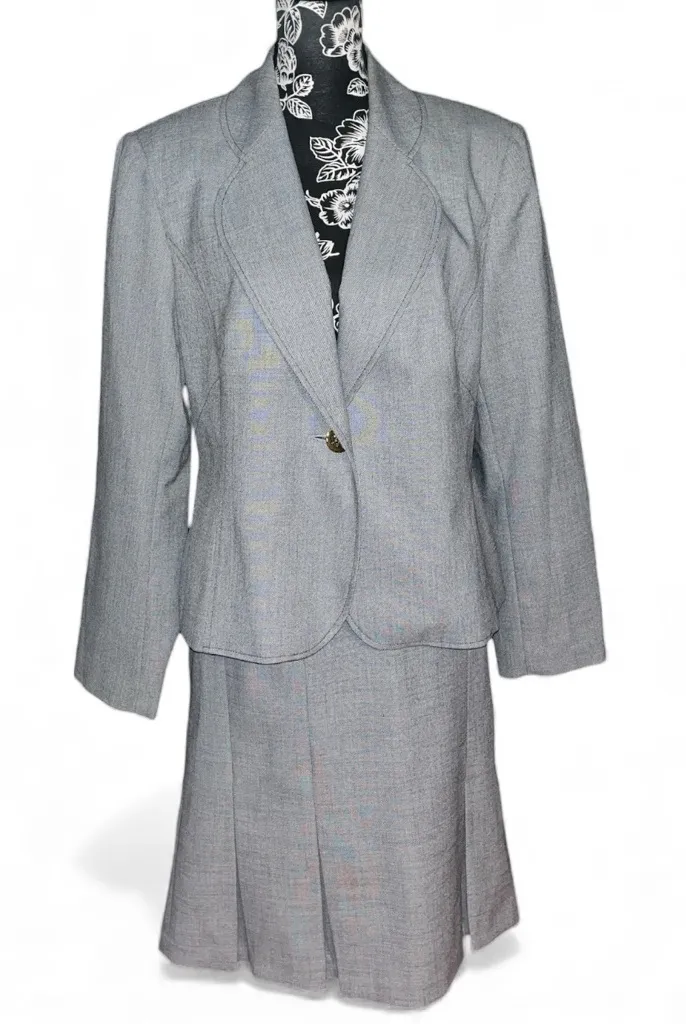 Suit Jacket: PTP 21” Length 24” Pleated Skirt: Waist 18” Length 24” 2 piece grey skirt suit made by... Show more